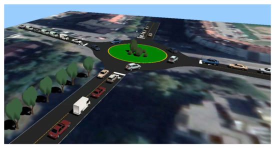- Trueblood, M.; Dale, J. Simulating Roundabouts with VISSIM. In Proceedings of the 2nd Urban Street Symposium: Uptown, Downtown, or Small Town: Designing Urban Streets that Work, Anaheim, CA, USA, 28–30 July 2003. [Google Scholar]
