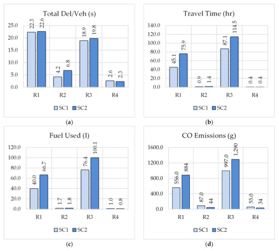 Basic differences of service parameters and pollutant emission: (a) Total Del/Veh (s); (b) Travel Time (hr); (c) Fuel Used (L); (d) R4: CO Emissions (g).