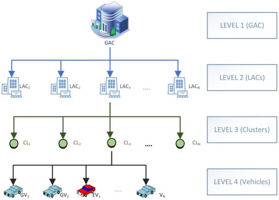In this paper, we proposed a tree structure, where a GAC is considered to be the root of the tree (see Figure 1). All of the LACs are in the second level, where all of them are connected to a blockchain, called GABC. GABC stores all of the information regarding the vehicles of a large area. LAC consists of several numbers of clusters that come in the third level of the tree. Each of the clusters is maintained by a CH and all the CHs under the same LAC are the members of another blockchain, called LABC, which stores all of the local vehicles’ public keys. Whenever a vehicle comes to join in a cluster, the corresponding CH check its the entry in the LABC to authenticate. In the fourth level, there are vehicles that are connected to their corresponding clusters. All of the communications between vehicles are handled by the CH under the cluster.