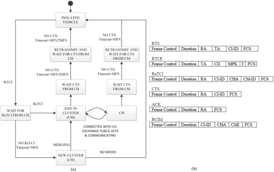 All of the vehicles moving through same direction will form a cluster. All of the vehicles are equipped with On Board Unit (OBU), Global Positioning System (GPS), etc., with high speed 5G internet connection and communication capability. Figure 2a illustrates the 0 finite state machine (FSM), which is the cluster formation for (English edited, Please confirm) GV. A GV is selected as CH and others become CMs. EVs will not participate in the process of becoming a CH, but rather wait to join in a cluster as CM. CH is responsible for managing all of the communication between the vehicles, i.e., the CH acts as the center of VSN. CH is also responsible for communicating with the LABC and the neighbour CHs. In order to support cluster based system and increase the efficiency of the message transmission, especially to ensure SDR for the SMs, we have proposed some changes in the IEEE 802.11 standard packet format and added some new packets. New Packets are: Registration To Cluster (ReTCl), Request To Cluster Formation (RTCF), and Request To Cluster Merging (RClM). Figure 2b presents the changes.