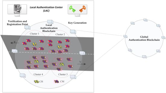 Blockchain is a distributed storage platform that provides additional security, immutability, temper-resistance, traceability, transparency, robustness, etc. Although blockchain was invented to store public ledger related information, because of its varieties of security and other features, it has become popular to store different types of information in various applications [5,6,7]. Blockchain stores information as blocks that are chained together and it is not possible to update or delete any information from the blocks; thus, it is called temper-resistance storage. Moreover, new blocks can only be added at the end of the chain, which makes the blockchain immutable and robust. However, the most important feature of blockchain is that it does not require any third party involvement to verify transactions, as all the members store a copy of the whole blockchain and, after a new block is added, every member updates their database. This ensures the transparency, third-party independence, and traceability of the blockchain. In this paper, we are going to use blockchain to store authentication related information of the vehicles, which helps us during registration and inter-cluster handover.