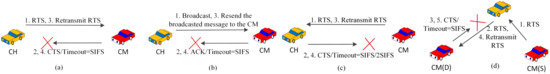 In the last two parts of Figure 4c,d, we have adopted the notion S and D, which denote the sender and destination, respectively. In those figures, during the cluster leaving process, a CM transmits data as a sender (S) to all D (that includes both CH and CM). After sending the RTS, the sender will be waiting for CTS. This waiting time is related to the SIFS time out. In our modelling, if S sends RTS to CH, then the timeout happens after SIFS interval. However, if S sends RTS to another CM, then the timeout happens for 2SIFS interval. Within the waiting time, if no CTS is received by the CM, then the RTS message is retransmitted. Figure 5c shows the case when CM retransmits the RTS, while Figure 5d shows the case when CH retransmits the RTS.