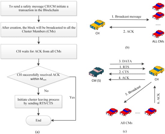 In the second part of the figure, a broadcasting based cluster leaving process is explained. Here, in the initial step, the CH broadcasts messages within the cluster, so that it is available to all CMs. Upon the successful receiving of the messages, the acknowledgement (ACK) message is sent to the CH by all existing CMs. The success of the ACK message receipt will validate the existence of any CM for that particular cluster. For those cases where ACK is not received by the CH, the CH will consider that the CM is not within the transmission range and the list is updated. Please note, for information integrity and availability, the message is retransmitted after a failed transmission and, at the same time, the SIFS timeout is also monitored. Figure 5b summarizes the whole process.