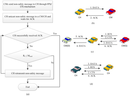 Similar to the safety message transmission that was discussed in the previous section, our proposed VANET model also proposes non-safety message transmission protocol in order to exchange general purpose messages. The non-safety messages include map download and updates, audio and media file transfer, web browsing, etc. The process of non-safety message transmission is supported by the unicast message broadcasting. In this setup, the sender (S) sends messages to the destination (D). CH and CM both act like a S or D. Based on the roles, one CH can send messages to a single CM. In this scenario, the effectiveness of the successful message transmission is observed by realizing the message acknowledgement (ACK). In another setup, one CH can send messages to another CH. In the last option, CMs can communicate among themselves via CH. In this setup, the communication happened between CMs and CH while using the RTS or CTS mechanism. Once the receiver CM receives the messages, then it sends an ACK message to the intermediate CH, and then CH forwards it to the sender CM. Throughout the process, the RTS/CTS ensures reliable message communication that avoids packet collisions. Those cases where ACKs are not received are considered to be unsuccessful message transmission. The retransmission of the non-safety messages happens if the number of retransmission (Rt) for the failure transmission is less than or equal to the maximum retransmission limit for the non-safety message (Mrnsm) [2]. Figure 7a summarizes the whole concept of non-safety message transmission and Figure 7b–d illustrate the handshake between the vehicles during NSMT.