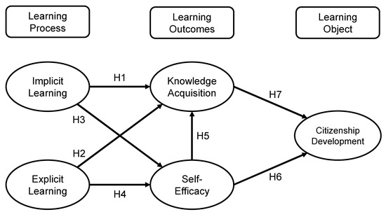 The distinction between implicit and explicit learning has typically been used for the student learning process [36]. This classification was first used in language learning [37] but has also been applied to physical learning, such as sports education [38]. This study applies the classification because the real-world EfSD using fieldtrips also contains both language and physical learning through group work for verbal communication and physical activity in the field. While implicit learning refers to a learning process in which information is unconsciously input and becomes knowledge, explicit learning refers to a learning process that consciously recognizes and controls what kind of information is input [39]. Of these two types of the learning process, implicit learning is the basis for knowledge acquisition [40]. Students learn by themselves through observing citizens or other students in real-world EfSD. Therefore, Hypothesis 1 is established as follows.