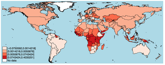 For the temperature and precipitation data, I follow Landis [24] and use the data from NOAA’s NCEP/NCAR Reanalysis Monthly Means Dataset 1948–2011 (in degrees Celsius) and monthly precipitation data (mm/month) from the Global Precipitation Climatology Project Version 2.2, respectively. Following Landis [24], I aggregated these data at the country level and employ measures of temperature and precipitation shocks. A temperature/precipitation shock is a substantial (or extreme) deviation from a “normal” climate pattern, i.e., the standardized temperature/precipitation deviation (see [25]). Shocks in temperature and precipitation increase climate variability with immediate effects. For example, countries affected by low levels of precipitation suffer from various extreme conditions, including droughts. This “can cause disruptions in economic and social systems” [24] (p. 606) and [26], especially in vulnerable societies with low adaptability measures. Specifically, as described in detail in Landis [24] (p. 608), measures of temperature and precipitation shock use the monthly deviation from a country’s long-term monthly mean. These can be either negative or positive deviations (not absolute values). More information on the explanatory variables can be found in the Appendix A.