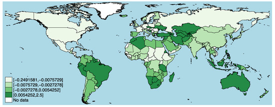 The coefficient estimate of temperature shock (lag)—destination is −0.19 (Model 2), the substantive short-term effect of temperature shock is −21 percent, i.e., for a one-unit increase in that variable, the geometric mean of emigrants decreases by 21 percent, and the asymptotic long-term effect is −4.32. This means that individuals from warmer-temperature countries migrate to colder countries. Regarding the climate indicator of precipitation, the coefficient estimate of the precipitation shock (lag) at the origin is −0.17, the substantive short-term effect of precipitation shock at the origin is −18.5 percent, i.e., for a one-unit increase in that variable, the geometric mean of emigrants decreases by 18.5 percent, and the asymptotic long-term effect is −3.84. This reflects previous findings on precipitation that are, in general, ambiguous [37]. The precipitation shock indicator at the destination does not have a significant impact on emigration though. These estimates are statistically significant at the 1 percent level. Given that I control for a large set of alternative explanations, including year- and country-fixed effects, there is strong confidence in the validity of my findings.