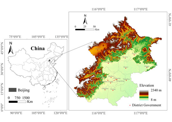 The study region, i.e., the city of Beijing (16,410 km2), is located in Northern China and is characterized by a variety of landforms and a rich cultural history. The terrain of Beijing slopes downwards from the northwest to the southeast (Figure 1). The city’s average population density was 1313 person/km2, and the population density of the central urban area was 8929 person/km2 in 2018. Along with rapid urbanization, the area of developed land dramatically increased from 485 km2 in 1990 to 1525 km2 in 2018. As a famous historical and cultural city, Beijing has hundreds of key cultural relic protection units, including 6 world heritage sites, such as the Great Wall and the Forbidden City.