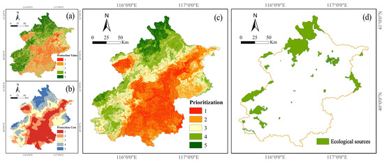 (a) Protection values, (b) protection costs, (c) protection prioritization, and (d) ecological sources.