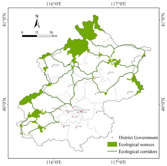 where Rw is the weighted resistance, Rl is the resistance coefficient of different land-use types, and Rd is the resistance coefficient of different distances from developed land. For example, the weighted resistance value of a grassland grid (Ri = 10) that is 600 m from developed land (Rd = 30) is 20 (= (10 + 30)/2). To improve the accuracy of ecological corridor identification at the boundary, the scope of analysis of the resistance surface is larger than Beijing’s administrative boundary.