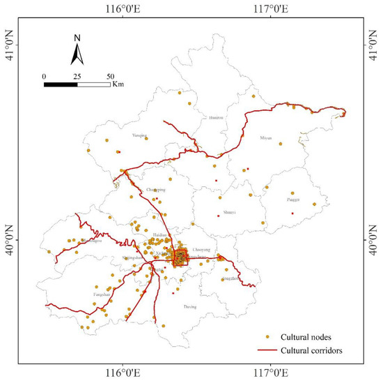 Figure 5 illustrates the 423 cultural nodes. More than half are in the central urban area and the rest are scattered in the peripheral area (see Appendix A Table A3 for details). More cultural nodes are in the southwest and fewer in the northeast. Six historical and cultural towns/villages are all in peripheral areas with lower levels of urbanization, where many high-value historical buildings and ancient features are completely preserved. For example, Lingshui village has extremely rich cultural deposits that originated from the Ming Dynasty. In the north of Beijing, the Great Wall extends from the west to the northeast, along which there are many famous historical relics, such as Badaling, which is famous for its magnificent scenery, facilities, and profound history.