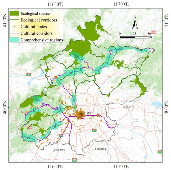 As illustrated in Figure 6, the integrated network visually reveals the relationships between ecological sources, cultural nodes, ecological corridors, and cultural corridors. Ecological sources are mainly distributed in exurbs, while cultural nodes are mainly located in central urban areas. However, the suburbs where ecological sources and cultural nodes coexist, such as Badaling Great Wall, Lingshui village, and Gubei town, are often the most popular tourist destinations, because they have multiple functions including leisure, experiencing traditional culture, and acquiring knowledge. Ecological corridors connecting all ecological sources interweave into a network in the exurbs, while cultural corridors radiate outward from the central urban area. At the same time, ecological corridors and cultural corridors share some intersection areas in the suburbs, which provide convenient positions for us to identify comprehensive regions.
