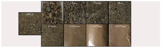 Upper and lower limits for the aggregates used in this investigation for mortar are established as per UNE-EN-933-2:1996 [72]. Figure 2 shows the distribution of the size of the FRCA according to the requirements established by the UNE-EN-933-2:1996 [72] and UNE-EN-933-1:2012 [76]. In order to achieve appropriate packing density of mortar, there is a need of particle size distribution. And, as some authors point out, the particle size distribution is one of the most determining properties of aggregates [56]. Figure 3 shows the aggregates retained in the different sieves. There is a reduction in adhered mortar attaching to aggregates, which is clearly visible in Figure 3.