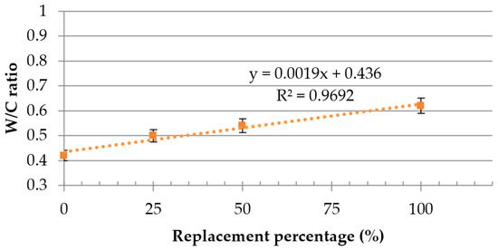 - To determine the water to cement (W/C) ratio, the consistency index of the mortars was kept constant in all the mixtures as 134 ± 4 mm, as established by the EN 196-1:2018 [75] and EN 1015-3:2000/A2:2007 [80].