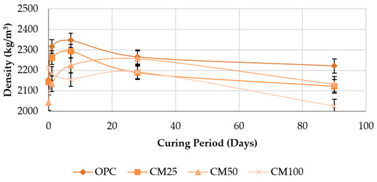OPC density increases with the increase in a curing period of up to 7 days and, after that period, there is a fall in density. Similar to OPC, the same trend is observed for the CM 25 mix, but the percentage of increase in density up-to 7 days is lower and a decrease in density is also observed. In the CM 50 mix, an increase in density is observed up to 28 days and, after that period, there is decrease in density. But for the CM 100 mix, the decrease in density is observed up to 7 days and, after that period, there is an increase in density up to 28 days and, again, there is a decrease in density. The lowest density is observed for the CM 100 mix at 28 and 90 days. There is no similar pattern of development of density for recycled mortar at various days of curing periods with respect to different levels of replacement of FNA with FRCA (Figure 6).