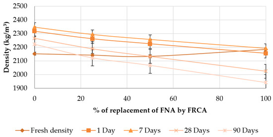 Apart from fresh density, similar pattern for various days of curing period with respect to different replacement of FNA with FRCA is observed in Figure 7, whereas the increase in FRCA content in the mix results in a decrease in density for all days of curing. Higher density is observed for the 7-day curing period for recycled blended mortar.