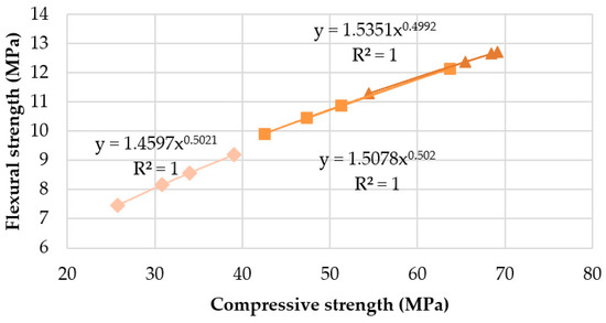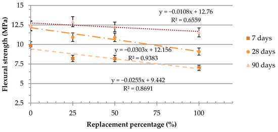 However, the decrease in the percentage of flexural strength of FRCA mortars is much lower than that of compressive strength. The decrease in the flexural strength of the CM 100 mixture was 7%, but the decrease in the compressive strength was 20%. The decrease in flexural strength is due to the rougher surface of FRCA that would improve the bond between FRCA and the cement paste [20]. In addition, the shape of FRCA is more irregular than that of FNA; the fracture path in the mortar incorporating FRCA would be greater than in the control mortar, which would require more energy for the fracture of the specimen, which leads to increased flexural strength [20]. Figure 8 shows that there is no prominent linear relationship between the replacement percentage and the flexural strength of recycled mortar, which is confirmed by the R2 value.