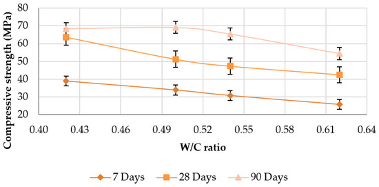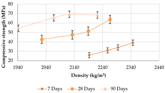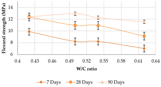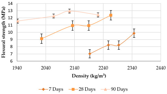 A decrease in flexural strength with respect to the increase in the W/C ratio is observed in Figure 9 and it is reported in literature data [15,20,56]. The decrease in flexural strength is similar to that of compressive strength with respect to the W/C ratio. The decrease in strength with the increase in the W/C ratio and FRCA content in mixes is going to be explained below (compressive strength paragraph). Flexural strength and density remain constant for CM 25 and CM 50 mortar for 7 and 28 days, as observed in Figure 10.