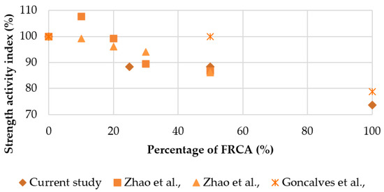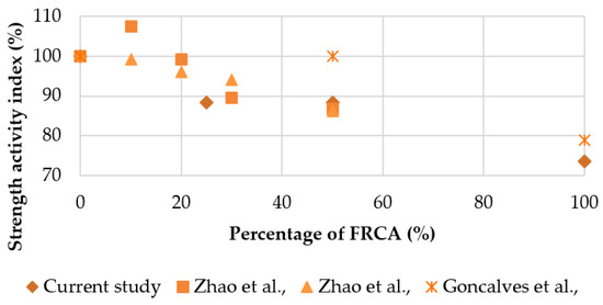 SAI for flexural strength (28 days) for this study and from literature data is shown in Figure 11. It is observed that there is a similar development of strength in this study with respect to studies from the literature data. SAI for 100% replacement of FNA with FRCA is greater than 70%, which indicates that mortar with recycled aggregate can be recommended for construction purposes.