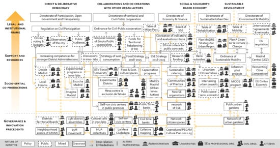 The data generated was gathered and analyzed in an incremental way through qualitative analysis, drawing on the three main categories included in our analytical framework as explained in the previous section: conditions of possibility for multi-actor collaboration, social innovation, and democratic innovation. This was achieved through the systematization of data in the field notebooks of the two researchers involved in fieldwork and the development of conceptual maps of the actors, institutional frameworks, and relations among these. During the research, as new policies and strategies were passed and our understanding of the processes increased, new connections and insights emerged that enriched the initial analysis and maps, such as the tables and figures included in Section 4. The analytical framework guided our characterization of the results explained in the following section and the discussion about the emergence, functioning, and implications of MAC in social innovation and urban regime change.