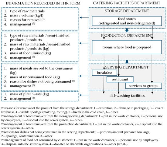 The workstation forms were constructed in tabular form. The forms were developed for the needs of the conducted research. The workstation form was discussed during consultations by the authors with the management and operational staff working in particular facilities. Each hotel received a form consisting of participant particulars and seven sets of tables (one set for each day). Each set consisted of tables concerning the (1) storage department, (2) production department, (3) breakfast buffet, (4) restaurant, (5) service for organized groups, and (6) dishwashing facilities. The persons responsible for the conduct of the study at the facility noted basic information in the tables, such as the (a) mass of raw materials used in production, (b) mass of dishes served to consumers, (c) mass of food waste resulting from the preparation of meals, taking into account the stage of the technological process, and (d) mass of food not consumed by customers. In order to facilitate the provision of information, a system of numerical values was applied which were allocated to the response options below the table. The type of information recorded in the form and the response variants adopted are presented in Figure 1. An example of one of the tables included on the form is presented in Appendix A.