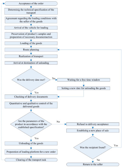 Figure 1 shows the procedure for the transport of bulk materials operating in the enterprise. Due to the specificity of the company specializing in the transport of organic cereals, the main problem is the place of loading. Therefore, most of the loading operations take place on farms. The problem lies in the lack of technical and infrastructure facilities. Larger farms have loaders, truck scales and silos from which it is possible to load directly onto the semi-trailer body, while smaller farms do not have such facilities. The first problem in the whole process of loading occurs when goods need to be weighed. Vehicles in the company are equipped with a computer weight system, while most farmers require weighing the vehicle on the weight indicated by the shipper. Often the weight is several kilometers away from the loading place. The contractor is in many cases uninformed about this fact, often not through the fault of the client, because the shipper always assures the client that he has all the technical facilities for loading on site. The problem of location of the scale also applies to the working time of the plants in which the scale is located. After a few hours of loading, which usually ends in the afternoon, the place where weighing takes place is often closed, and as a result the driver is forced to wait until the next day. The result of the whole problem is the inability to accurately plan the vehicle’s travel time to the destination, as well as the prolonged unnecessary journeys of the driver which results in increasing working time (limited by law). Another factor that extends the loading time is the lack of appropriate equipment at the loader. The problem of the lack of infrastructure on this type of farms results from many factors, e.g., these farms are mainly focused on organic cereals production with low scale of money investment. The problem is mainly intensified in the fall–winter period. Moving a vehicle with a total weight of 40 tons is difficult on this type of surface. In most cases, it is impossible to move independently on this type of surface and requires assistance of a heavyweight farm tractor. Each of the problems mentioned above automatically reduce the active driver’s working time during the day and enforce downtime. As the result planning further routes become difficult and unable to provide reliable information to the customer about the time of arrival at the place of unloading.