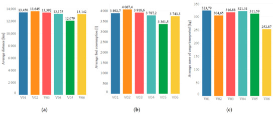 Considering the number of kilometers traveled with the load in relation to the distance traveled by drivers (Figure 3), it can be observed that the V05 driver had the lowest percentage of the distance with the load compared to other drivers (35.93% of the distance is so-called empty runs). In turn, the V04 driver’s vehicle was the optimal means of transport in terms of the aforementioned traveled distance with load (80.9%).