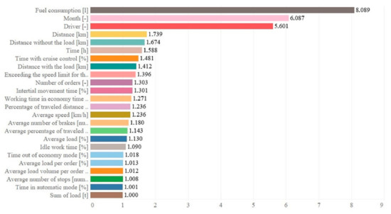 In summary, it has been shown that 12.5% of the variables analyzed have the greatest impact on the company’s profit (3 factors: total fuel consumption, month and driver), 25% of the variables are completely redundant (the last 6 factors), while 62.5% have only partial impact (15 others) and may be a source of further business long-term savings.