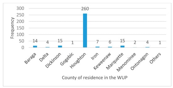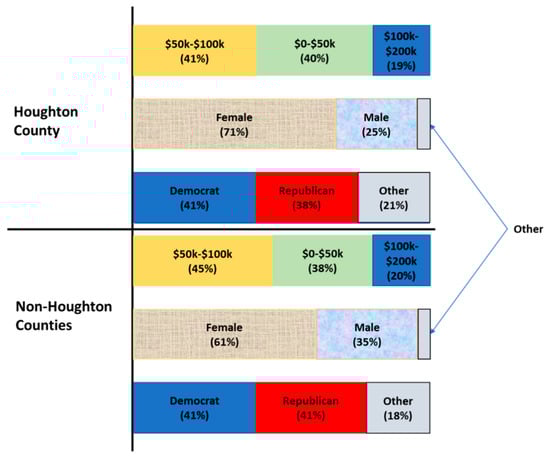 The most represented demographic among respondents was female respondents from Houghton County, where 62% of the 226 respondents indicated their gender as being female, while 22% indicated male. The rest did not respond to this question or indicated “other.” In the non-Houghton counties, 61% of respondents were female while 35% were male (see Figure 3). The income distributions observed for Houghton and the combined rest of the counties in the WUP (non-Houghton counties) were close for the total of the combined categories of $0–$50,000 and $50,000–$100,000. While the combination gives 81% of respondents in Houghton County, it is 83% of respondents in the case of non-Houghton County. Similarity between the groups was also observed with the income distribution between $100,000–$200,000. These demographic results, especially the household income ranges, aligned with census data on social explorer [] for Houghton County. In the same vein, the population by household type also showed that the number of female householders doubles that of male householders on the census data. This is an indication of non-bias in the sampling.