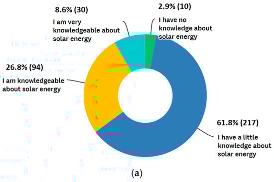 On the question about knowledge of different RE technologies for electricity generation in the WUP, results showed that more than 60% of the 351 residents that responded had a little knowledge about solar and wind. In the case of hydro, however, the percentage was 10% less. Across each technology (see Figure 2a–c), more residents indicated that they were either knowledgeable or very knowledgeable about solar and wind energy, compared to lower proportions for hydro. The knowledgeable rates (the combination of knowledgeable and very knowledgeable) as perceived by the WUP residents for each RE technology were approximately 35%, 28%, and 25% for solar, wind, and hydro, respectively. In addition, hydro was the RE technology with the lowest level of knowledge base among the respondents. While the overall result in this category shows low knowledge of RE across the three technologies, it does not indicate that the opinions of respondents are invalid. Rather, it means that a complementary interview of selected residents might be needed to obtain a full narrative of why each respondent selected their knowledge rate. This will help in ascertaining the veracity of their opinions for future policy and decision-making processes.