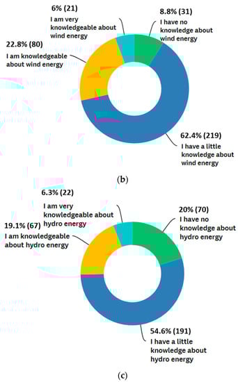 WUP residents’ response distributions regarding their knowledge of solar, wind, and hydro power for electricity. The subfigure (a) represents residents’ responses on their knowledge level of solar energy technology, (b) on their knowledge level on wind energy, and (c) on their knowledge level on hydro energy.