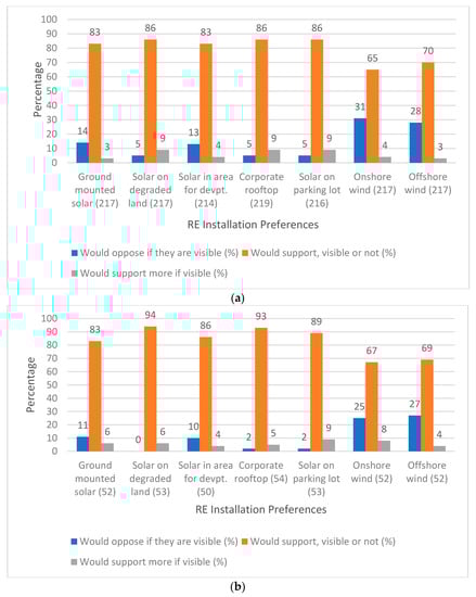 Another question asked in the survey relates to the kinds of RE technology installation options that residents would support and how their support would change based on the visibility of the technologies (Figure 4a,b). The frequencies of each response in each category are given as numbers in parenthesis after the label on the x-axis. In Houghton County, more than 80% of the respondents indicated that they would support all of the various RE installation options (see Figure 4a), with 86% willing to support solar panels mounted in degraded land, panels on commercial or industrial rooftops, and panels that are shading parking lots or garages, and 83% indicating their support of ground-mounted solar technology and solar technology mounted in areas earmarked for development. All these responses are regardless of whether the panels are visible or not.
