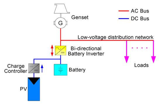 Generally, the bi-directional battery inverter provides this reference; however, this can also be provided by the genset. Today, the bi-directional battery inverter is generally associated with the use of the V/f droop functions (droop control) for compatible parallel operation with a genset [32]. Note that by combining the two previous topologies (DC- and AC-coupling), it is possible to create a combined AC-DC-coupling topology, with part of the solar system connected directly to the DC bus and part to the AC side.