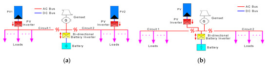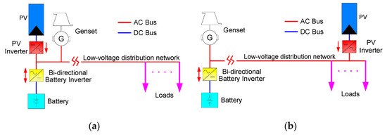 The AC-coupling topology can also be sub-classified into dispersed and centralized topologies. In centralized topologies, all PV arrays are connected to a single AC bus (close to the battery inverter and the genset) before connecting to the distribution network, as shown in Figure 2a. In contrast, in dispersed topologies, the PV sources are connected directly to the distribution network at multiple points close to the load, as shown in Figure 2b.