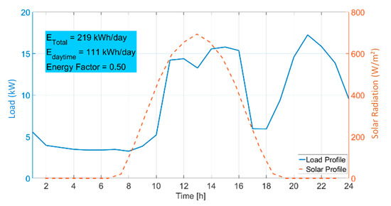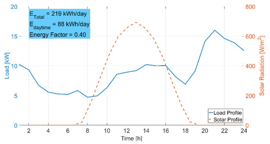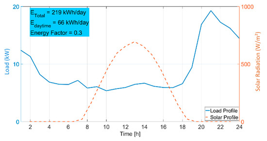The three load profiles correspond to (i) a typical residential curve (see Figure 4), (ii) a residential curve with a small number of commercial loads (see Figure 5), and (iii) a curve with a lot of commercial loads as well as residential load (see Figure 6). Note that all load profiles have the same average daily electricity consumption (219 kWh/day); however, the energy factors are different for each case, varying between 0.3 and 0.5. In turn, the solar profile is constant for all cases and corresponds to a location near the equator (0.5° S).