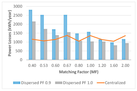 As expected, the analysis of Figure 7 shows that in a dispersed topology, the power losses increase due to the non-unity PF operation of the PV inverters, regardless of the MF value. However, the relationship between dispersed and centralized power losses is observed to be a function of the MF and PF. For unity PF, the dispersed topology has lower power losses than the centralized topology for an MF above 0.8, and it is necessary to achieve MF values above 1.2 to have the same result with a 0.9 lagging PF.