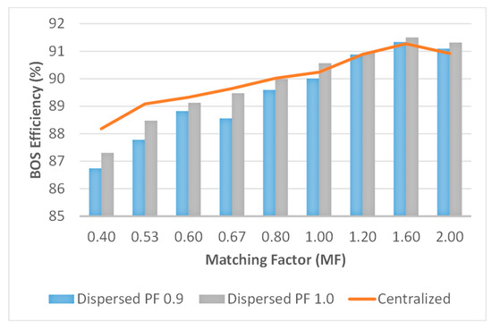 From the results, the centralized topology is beneficial in most situations. For low values of the MF, the gain obtained (with the centralized topology) in BOS efficiency is 1.5% as compared to the dispersed topology operating with a 0.9 lagging PF (this gain drops to 0.9% for unity PF). For high values of the MF, the centralized topology has almost the same BOS efficiency as the dispersed topology, regardless of the PF. Yet, as the MF increases, the BOS efficiency also increases, independently of the topology of the microgrid (centralized or dispersed). This is because high MF values are associated with low PV penetration, as shown in Table 1. Consequently, power losses in PV inverters are lower for high MF values than for low ones.