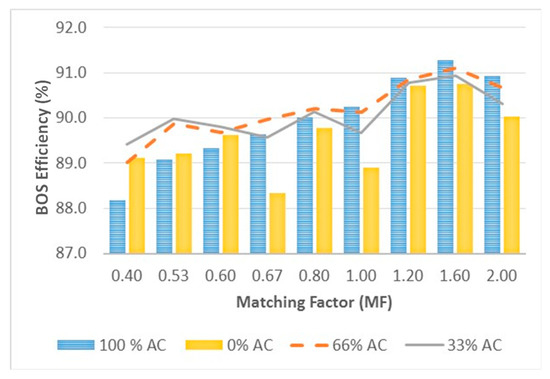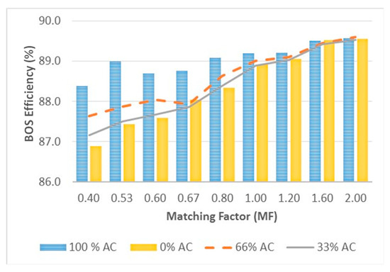 As expected, for low values of the MF, the DC topology has better performance than the AC topology and vice versa; however, the difference in BOS efficiency is not as significant as that shown in Table 3, mainly for low values of the MF. For both high and low MF values, the difference in BOS efficiency is approximately 1.2%.