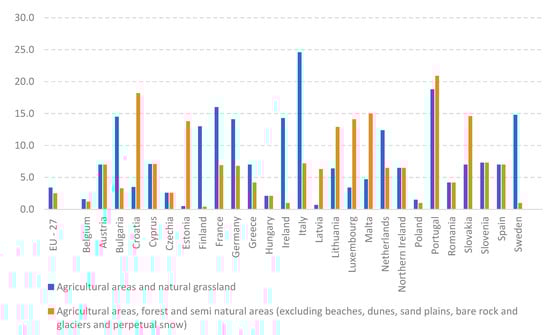 According to Eurostat [], the annual rate of water erosion in Europe’s agricultural land, forests, and semi-natural areas averaged around 2.5 t per ha in 2016, while the annual mean rate of water erosion in agricultural areas and permanent grasslands in Europe was 3.4 t per ha. Within the European Union (EU), the countries with the highest erosion rates in agricultural areas and natural grasslands are Italy, Portugal, France, Germany, and Sweden [] (Figure 1).