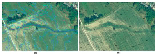 Erosion observed in the studied area (a) Orthophoto map and the erosion details with arrows (© Eurosense, s.r.o. and GEODIS Slovakia, s.r.o.); (b) Overlay of orthophoto and land register maps after land reparcelling (ZBGIS).