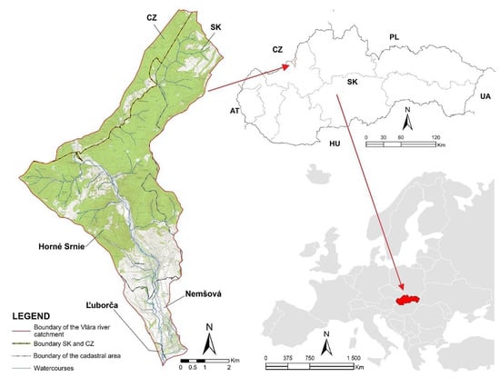 The modelled area is the Vlára water catchment area (Figure 3), a tributary of the Váh River flowing from the Czech Republic whose source is below Klášťov Mountain (752.9 m) in the Vizovice Highlands. The Vlára runs in a southwest direction through the Vlára pass in the White Carpathian Mountains into Slovakia. The entire area is drained by the river and its tributary streams, the Vlárka, Branný, Čakanovský, Bradelský, Sietne, Hornosrniansky, and Kremnica. The Vlára passes through the cadastral district of Horné Srnie and empties into the Váh about one km from the village of Nemšová [].