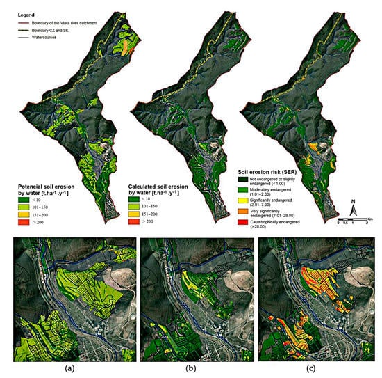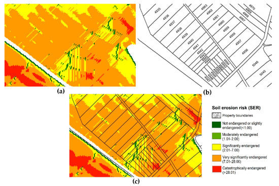 Water erosion intensity: (a) potential intensity; (b) calculated actual intensity, (c) degree of soil erosion risk (shown in detail with property boundaries).