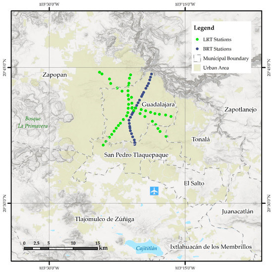 The Guadalajara Metropolitan Area (GMA)—the capital of the state of Jalisco, one of 32 states of the Mexican Republic—has 4.5 million inhabitants spread over 3365 square kilometres [76] (Figure 1). The GMA is served by a multimodal transport system network. In accordance with international trends, sustainable transport means are promoted by university authorities as a way to reduce environmental impacts on cities [71]. Thus, the modes of transport considered in this study were the LRT, the BRT, high-quality buses, conventional buses, and bicycles. According to the Office of Agrarian, Territorial and Urban Development (SEDATU) [77], Jalisco is among the states with the highest federal and local public investment in sustainable mobility projects, particularly in public transport (PT) and bicycle lanes.
