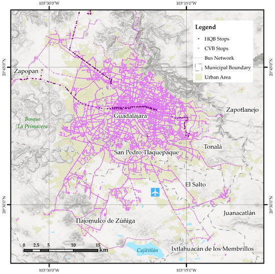 High-quality and conventional bus network in the Guadalajara Metropolitan Area (GMA). Source: authors, based on [78,79,80,81,82,83].