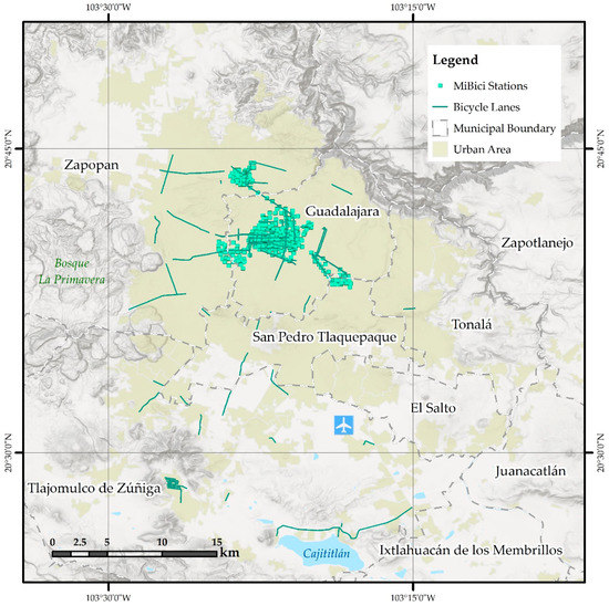 - IMEPLAN, I.M. de P. (Metropolitan P.I., Guadalajara, Mexico) Criterios Para La Prueba Piloto Relativos a La Implementación Del Sistema de Bicicletas Sin Anclaje En El Área Metropolitana de Guadalajara. p. 6. Available online: http://imeplan.mx/sites/default/files/archivos_pdf/Criterios-dockless.pdf (accessed on 16 December 2020).