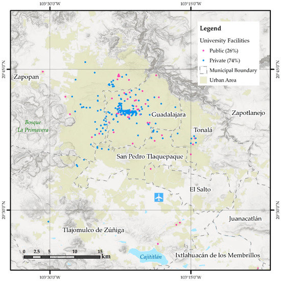There are different sources regarding university statistics. According to the National Institute of Statistics and Geography (INEGI) [86], there are 274 UFs in the GMA (see Figure 5). Only 26% of them are publicly financed, even though public and private universities serve 163,678 and 86,738 students, respectively [87]. Both public and private universities provide services to students with financial difficulties, and most of the private universities have scholarship programmes for underprivileged students, e.g., ITESO (Technological and Higher Studies Institute of the West from its initials in Spanish) where almost half of the students receive financial aid. As shown in Figure 5, though the UFs are distributed in the central municipalities of the GMA, there is a concentration of public UFs in the central area, and private ones are located mainly in the municipalities of Guadalajara and Zapopan. The mid-south of the city is served by only a few public UFs, and the south, east and north of the GMA have few UFs.
