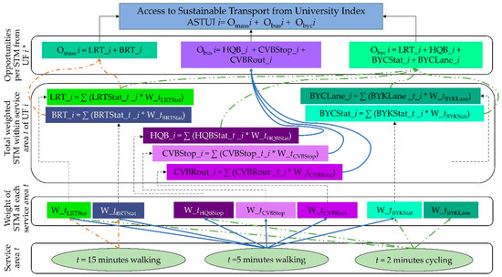 Figure 7 illustrates the numerical model for the ASTUI calculation. It includes three particularities of the study area. First, given that people are willing to walk up to 5 min to reach buses, they would also walk this distance to reach a bicycle-sharing station to complete the journey by cycling. Therefore, the MiBici stations were counted within this service area. Second, bicycles are allowed on LRT and the high-quality buses, i.e., Sitren. Consequently, these two types of stations and stops were computed for the service area of 2 min cycling. This is not the case for BRT or conventional buses. Third, there is only one route at the LRT, BRT and Sitren stations. Thus, the routes for these modes were not counted, in order to avoid biases in the PCA. In contrast, there is usually more than one route at the conventional bus stops and more than one cycle lane at the MiBici stations. Thus, the routes and cycle lanes were counted for both modes. Based on these particularities, the spatial analysis for the service areas and the number of STMs were computed by means of Network Analyst, with the ModelBuilder from Esri®.