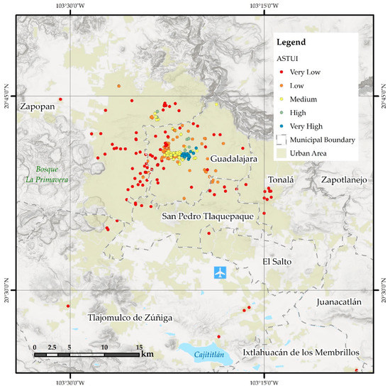 Access to Sustainable Transport from University Index (ASTUI) in the Guadalajara Metropolitan Area (GMA). Source: the authors, based on [78,79,80,81].