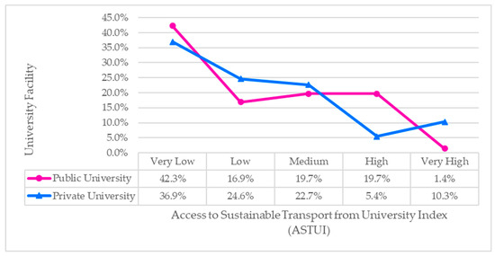 According to the calculation of the ASTUIs and their classification by clusters, most of the university infrastructure has low and very low ASTUI values, i.e., 62.0% and 42.3% for public and private infrastructure, respectively. Nevertheless, as shown in Figure 9, there is no spatial pattern of inequity between public and private infrastructure. Although more private infrastructure is observed in the three most disadvantaged strata, the relative difference between them is small, i.e., 5%, 8%, and 3% for ‘Very Low’, ‘Low’ and ‘Medium’, respectively. There are 14 percentage points of difference in the ‘High’ stratum that favours public infrastructure. In the ‘Very High’ stratum, private infrastructure is favoured over the public infrastructure by 9 percentage points.