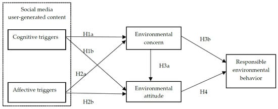 In the context of responsible environmental behavior, affective triggers reflect individual perceptions of the world from an empathetic perspective [47]. Previous studies verified that individuals with more environmental knowledge have enhanced environmental concerns [54]. Another study characterizes affection as a psychological feeling that is sensitive to the environment and generates internal environmental concerns [55]. It has been recommended that the higher level of environmental knowledge of travelers enhances their environmental sensitivity and, as a consequence, these environmental sensitivities influence the action of the environmental attitude. In the context of UGC in social media communities, it is assumed that the sensitivity of an individual’s perception could be enhanced. Thus, the following hypotheses have been proposed: